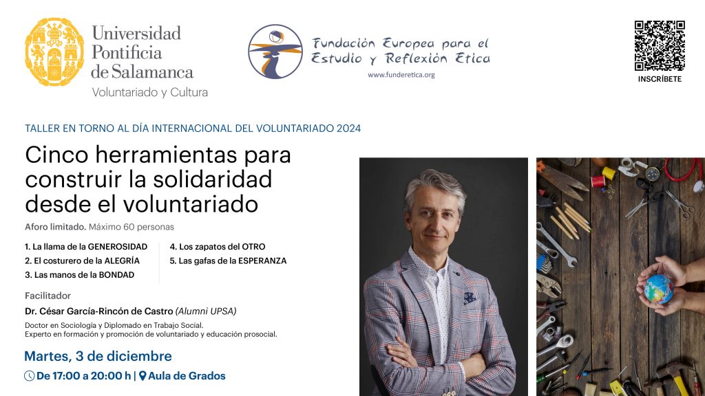 Cinco Herramientas para Construir la Solidaridad desde el Voluntariado, es la propuesta de un Taller en torno al Día Internacional del Voluntariado (5 de diciembre de cada año) que ha desarrollado César García-Rincón de Castro, en colaboración con FUNDERETICA, para entidades sociales y educativas. Pero no es exclusivo de dicho día, sino que se trata de una taller permanente e itinerante.